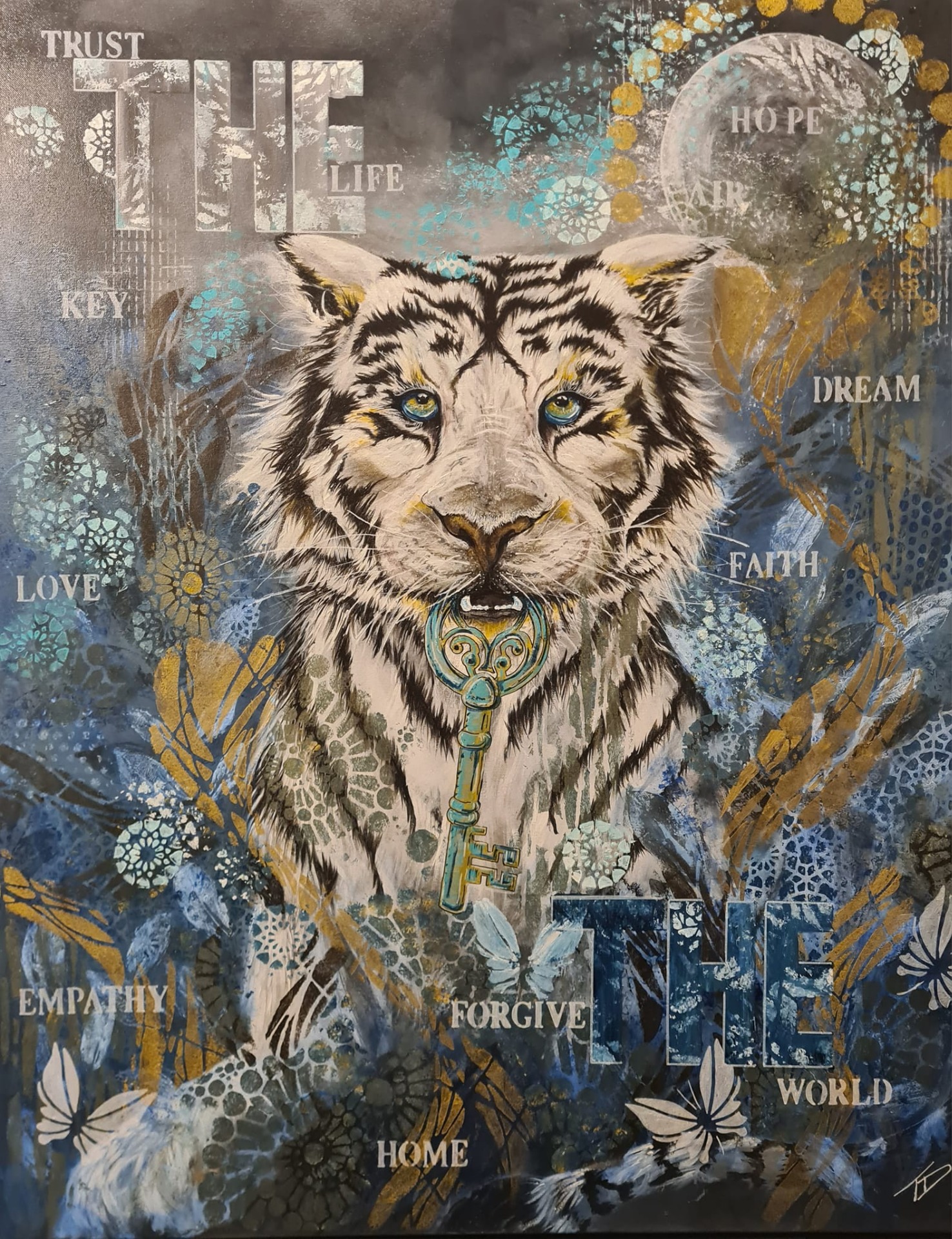 I naturen betragtes den hvide tiger som uddød. Der findes få tilbage i fangeskab. Maleriet illustrere, eller sender tanker om at vi skal passe på livet.